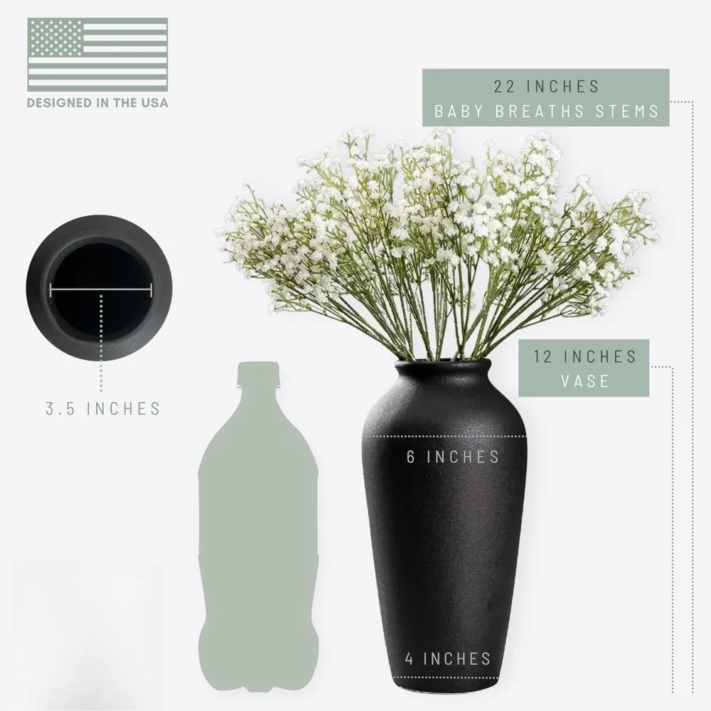 12" Tall Black Ceramic Vase, Speckled Textured Minimalist, with 15 Stems of 22" Faux Artificial White, Fake Flowers in Vases