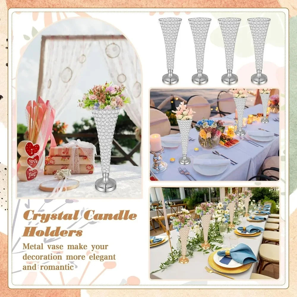 4 Pcs Crystal Trumpet Flower Vase 20 Inch Tall Wrought Iron Crystal Vase Flower Stand Centerpieces Wedding Table Decor for Home