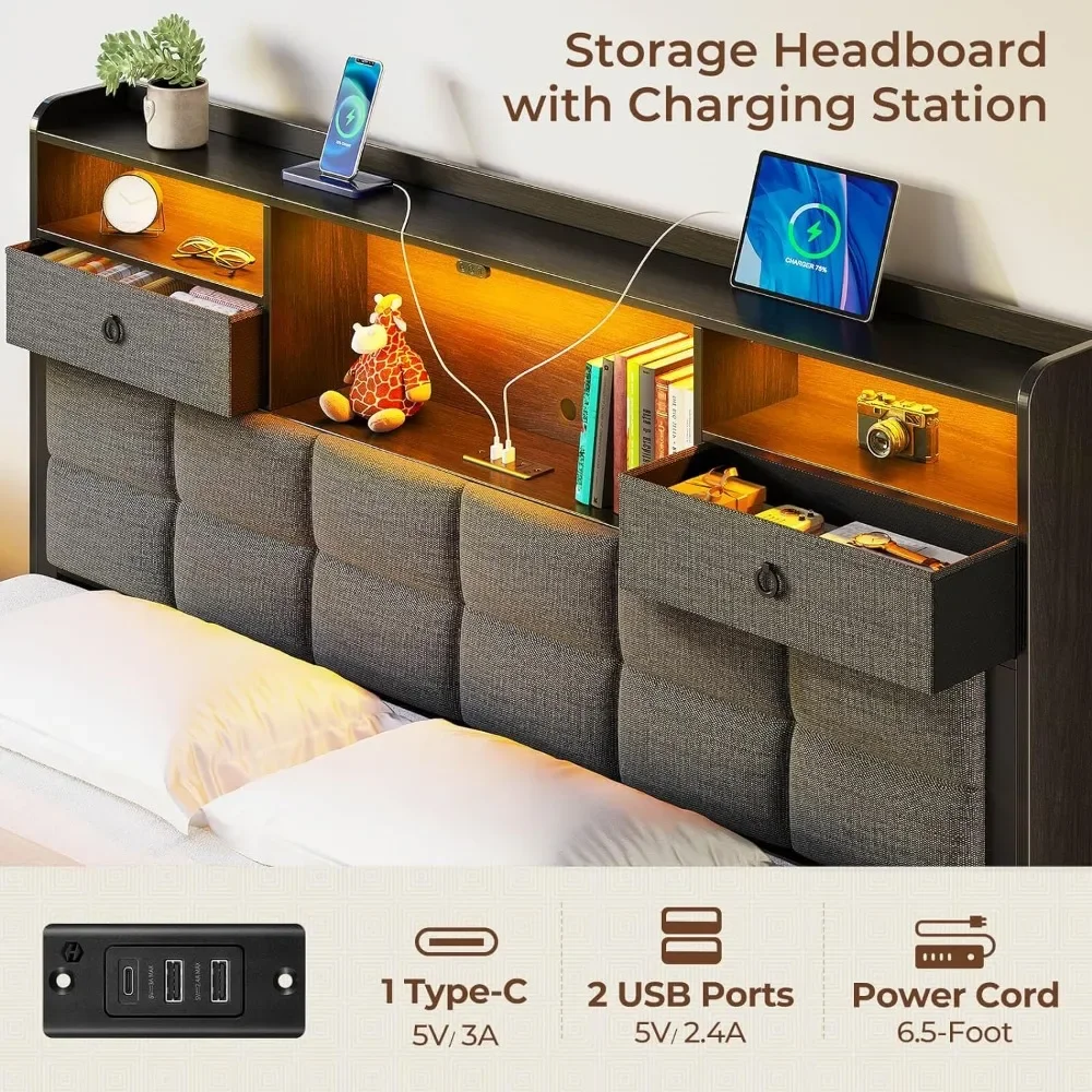 Bed Frame King Size with Drawers and Charging Station, Upholstered Platform Bed with Storage Headboard and LED Light