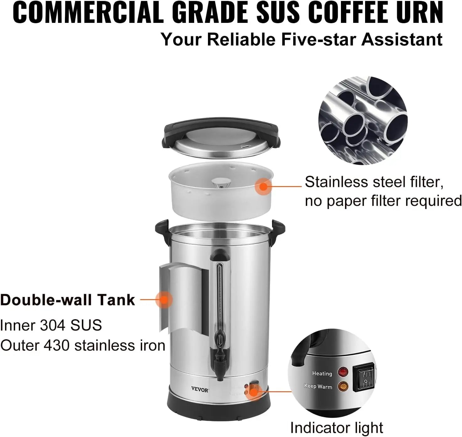 - Quality You Can Rest Assured: The entire hot water urn is designed with a very delicate design. It features double food-grade stainless steel body and filter! And guess what? You don't need to use paper filters anymore! The clear water level mark in the coffee urn can help you see when you need to refill. We also include a drip tray to avoid liquid dripping and soiling your table top. The spill-proof lid avoids spillage during movement, and the anti-scald handle and lid protect your fingers from