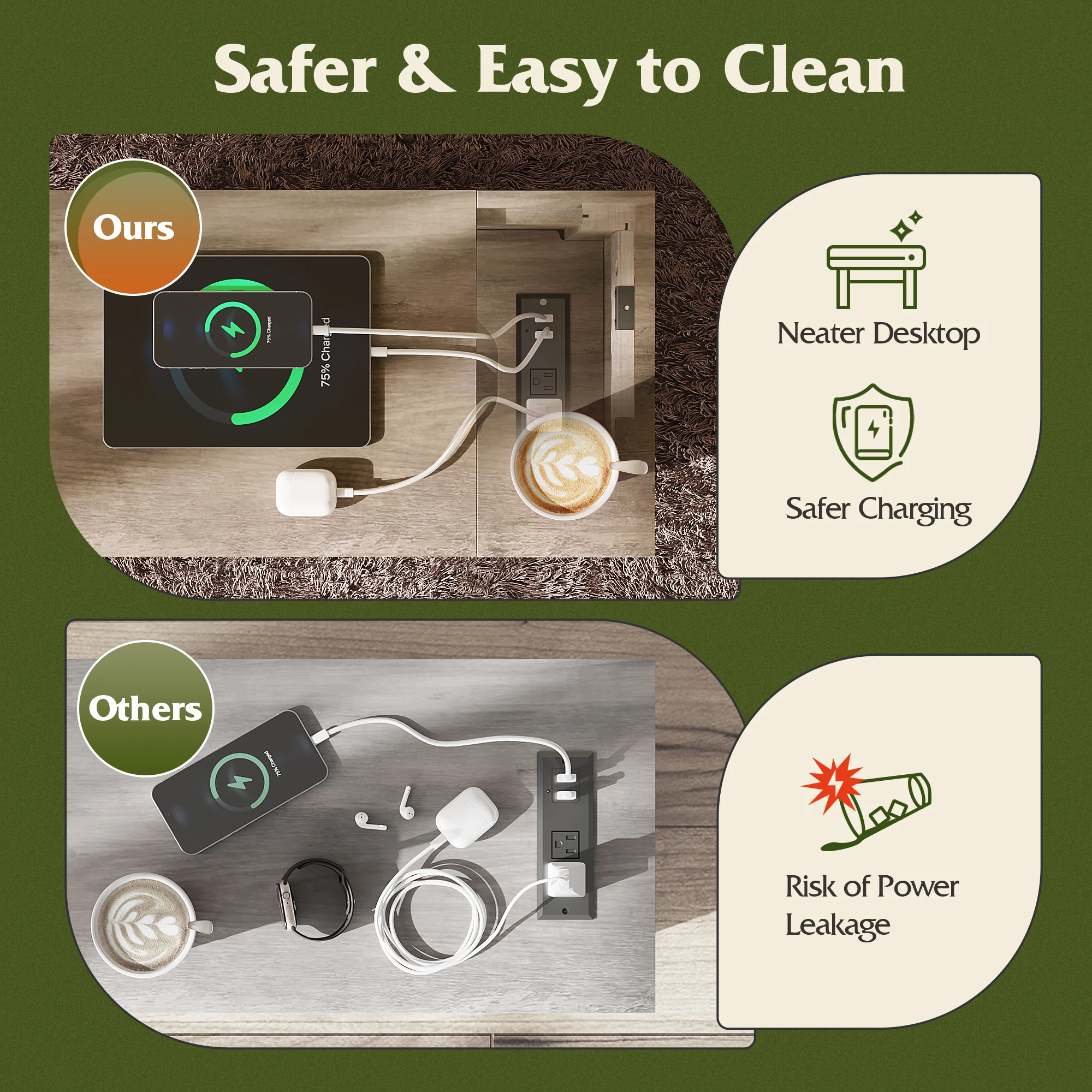 2.Built-in Charging Station: Equipped with 2 AC outlets and 2 USB ports, it provides easy charging access for your devices, ensuring you're always powered up.