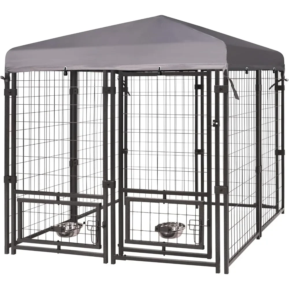 Outdoor Dog Kennel, Large Heavy Duty Metal Dog Cage Dog Pen Enclosure House with Roof & Rotating Feeding Door