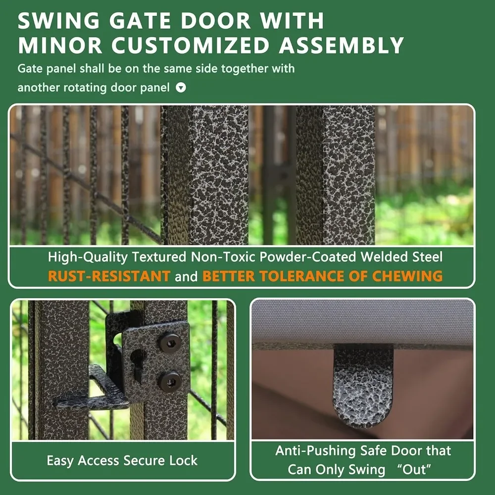 - High Quality Frame: This dog playpen is constructed with high quality textured power coated welded steel which is non toxic and rust resistant. There is no need for you to worry about pet chewing may do harm to the kennel, the frame of this outdoor kennel has a better tolerance of chewing. Believe that this metal dog kennel enclosure is a comfortable house to your pet friends