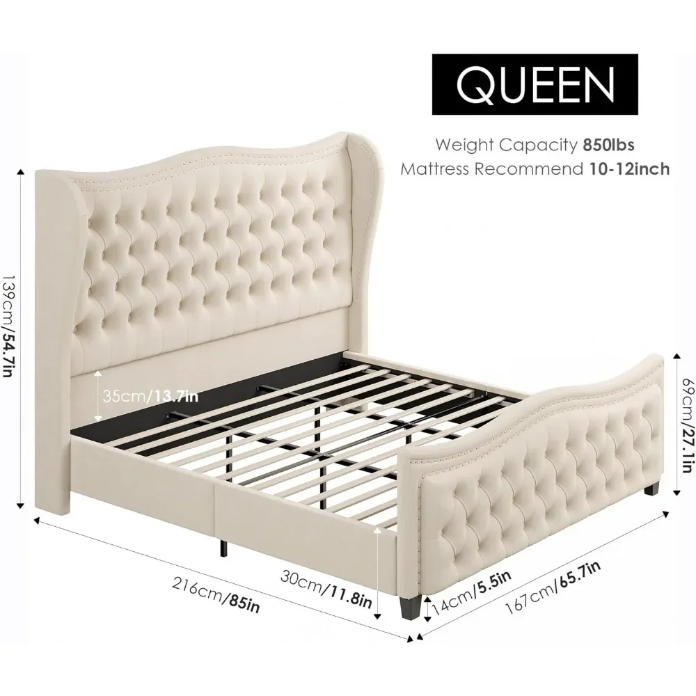 Queen Bed Frame, 55" Headboard Upholstered Bed with Tall Footbaord, Velvet Handmade Pleats Deep Button Tufted Wingback Platform