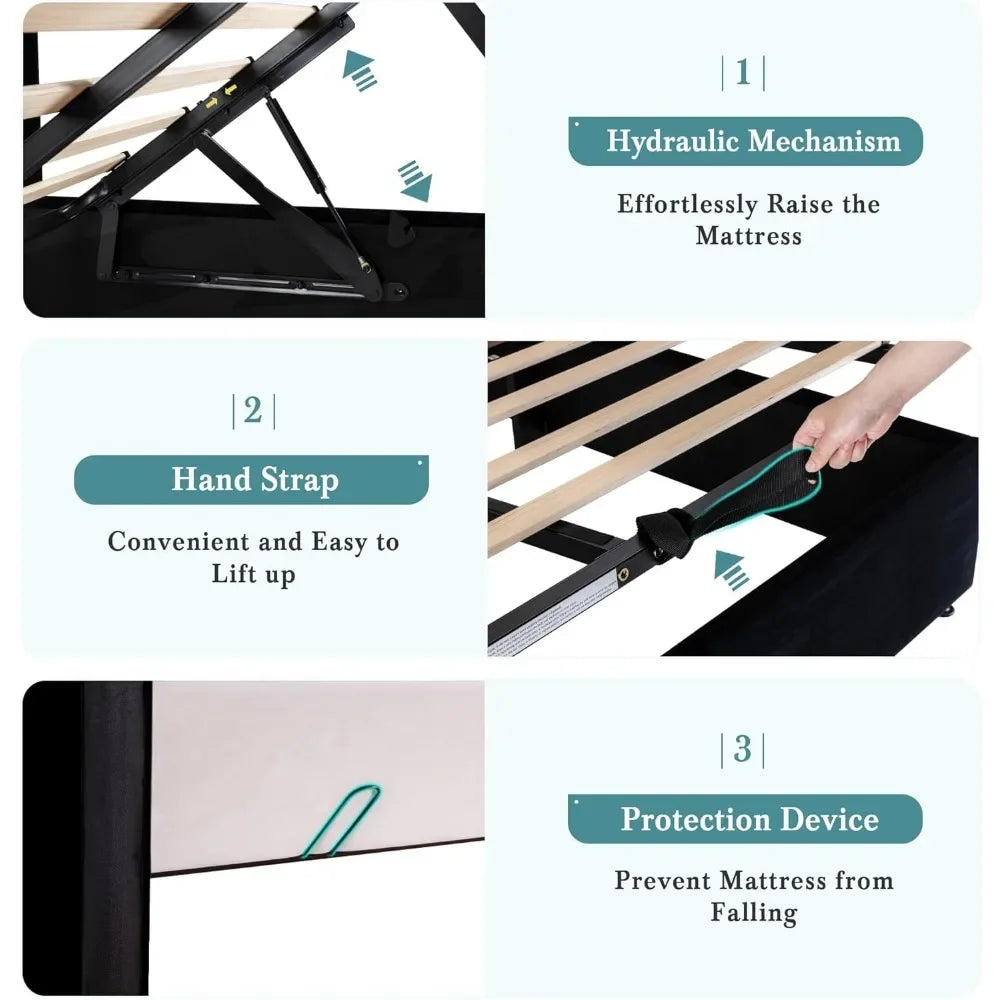 - EXCEPTIONAL FUNCTIONALITY: Designed with space-saving in mind, the lift-up storage feature is ideal for compact rooms craving additional storage options. Its hydraulic mechanism effortlessly raises the mattress, unveiling a generous compartment below. Perfect for stowing bedding, seasonal clothing, or other items, this feature operates smoothly and reliably
