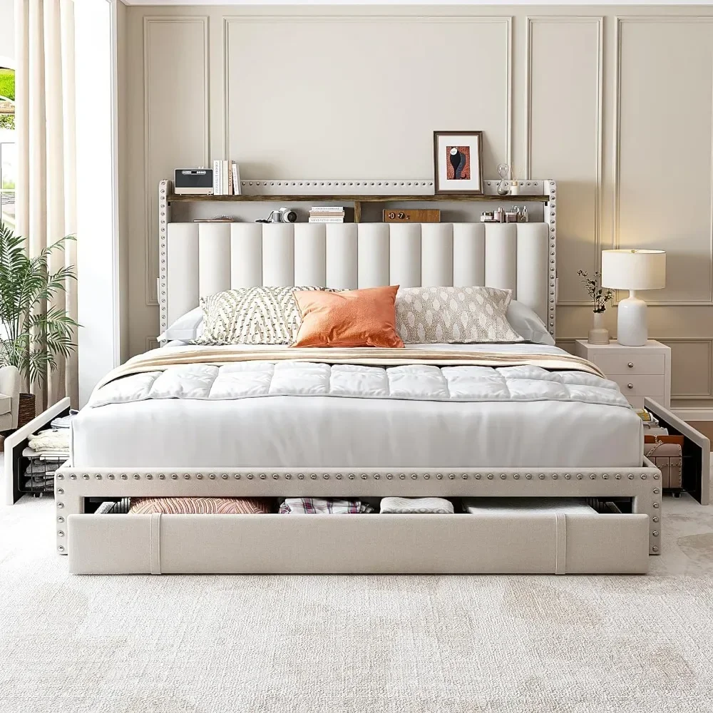 Queen size upholstered bed frame, Queen bed frame with 3 drawers, Queen size bed frame with headboard