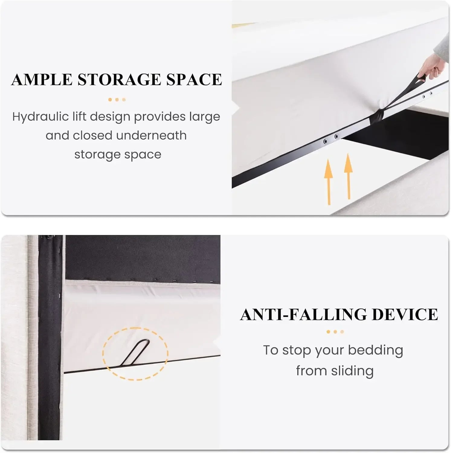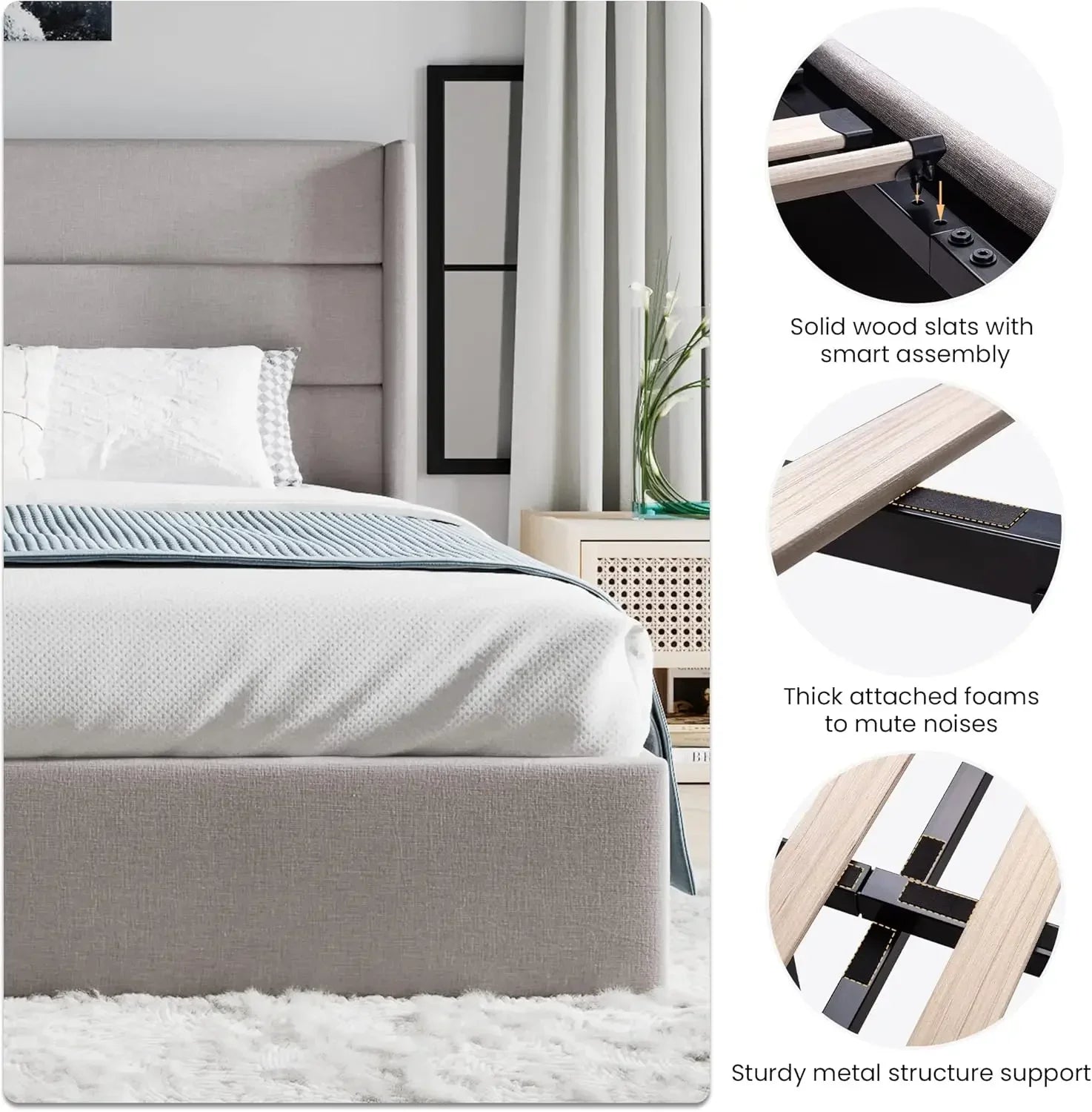 SHA CERLIN King Size Lift-Up Storage Bed: Modern Wingback Headboard, Upholstered Platform Frame, Hydraulic Storage, Light Beige
